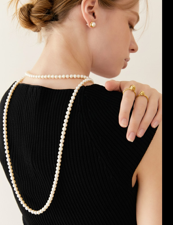 The incomplete organic form and the completely spherical pearl are mixed and matched or, the pearls from nature and artificially made metallic materials are mixed and matched as well.